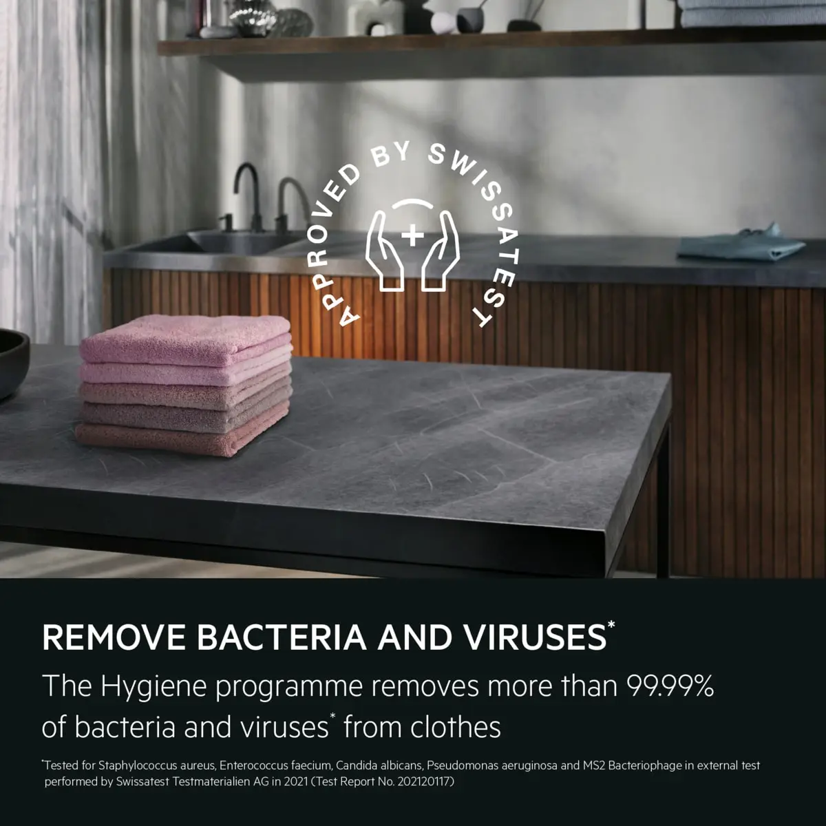 Das Hygiene-Programm trocknet bei 60 °C über einen konstanten Zeitraum und entfernt dadurch 99,9 % der Bakterien und Viren* in der Wäsche. Das Swissatest zertifizierte Hygiene-Programm beseitigt 99,9 % der Bakterien und Viren*