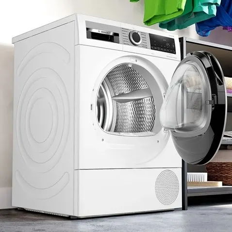 Der BOSCH WQG235D00 Wärmepumpentrockner mit 8 kg bietet die Energieeffizienzklasse C. Pro Standard‑Trocknungszyklus verbraucht das Gerät etwa 1,02 kWh. Der selbstreinigende Kondensator stellt zusätzlich die Langlebigkeit des Geräts sicher.